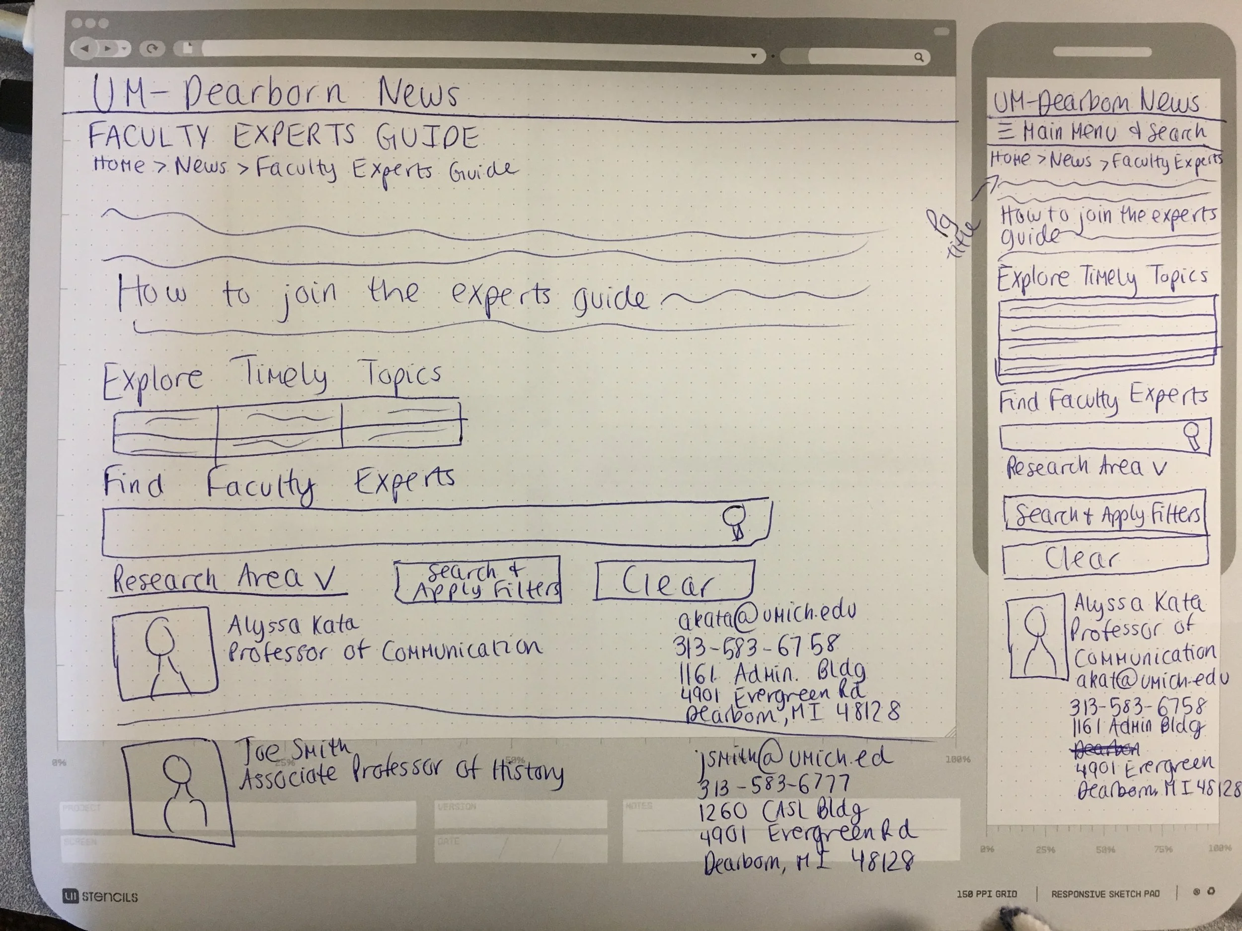 I partnered with the web director at the university to create wireframes for the new experts guide design and improved faculty profile pages, which were iterated upon based upon stakeholder feedback.